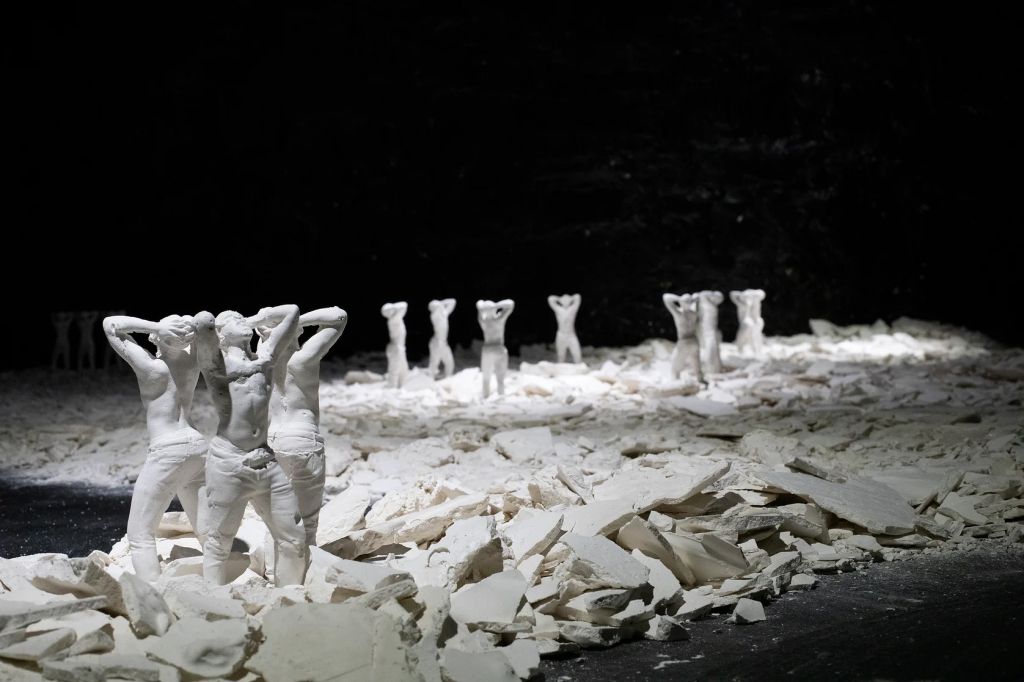 So, they are walking in this gallery space and then there’s this broken plaster on the ground. There’s no, “Do not touch,” signs, so somebody even walked across it during the opening. You’re walking on this ground that’s crumbling underneath you while these 8-inch lifelike figures are looking up at you in distress and crumbling and imperfect. The threshold that I approached that project from was to create an uneasy experience.