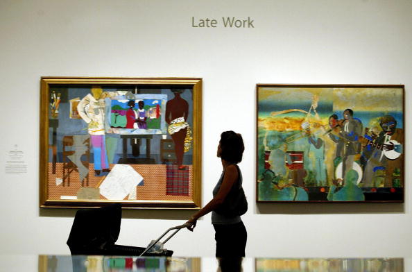 A visitor with a baby views the exhibit “The Art of Romare Bearden” at the National Gallery of Art, Sept. 15, 2003, in Washington, D.C. The exhibit marked the first time in the National Gallery of Art’s 62-year history that a show has been devoted to a Black artist. | Source: STEPHEN JAFFE / Getty